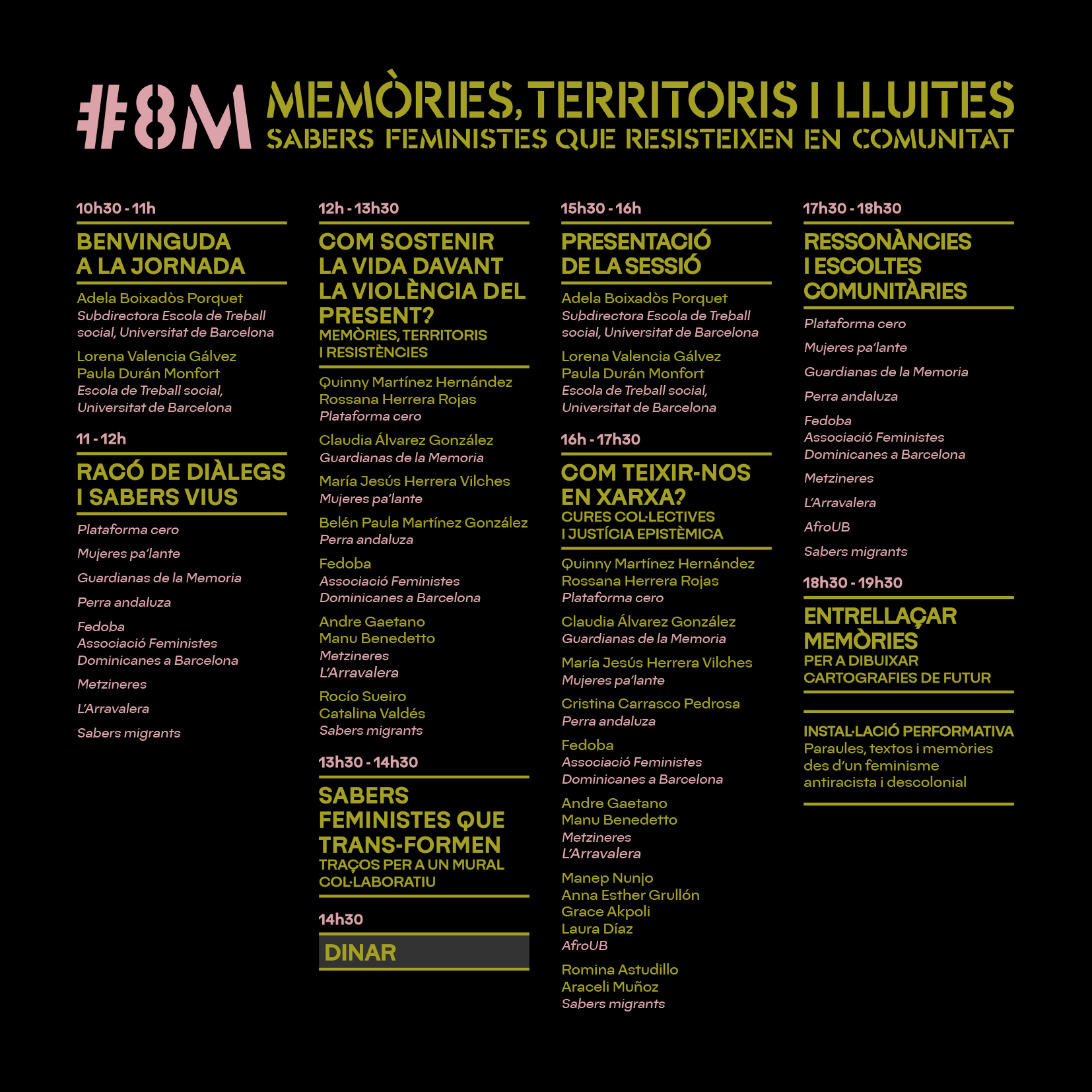 - La creació d’espais de diàleg on puguem escoltar-nos, compartir les nostres històries i reconèixer-nos des dels nostres múltiples recorreguts i llocs d’enunciació.