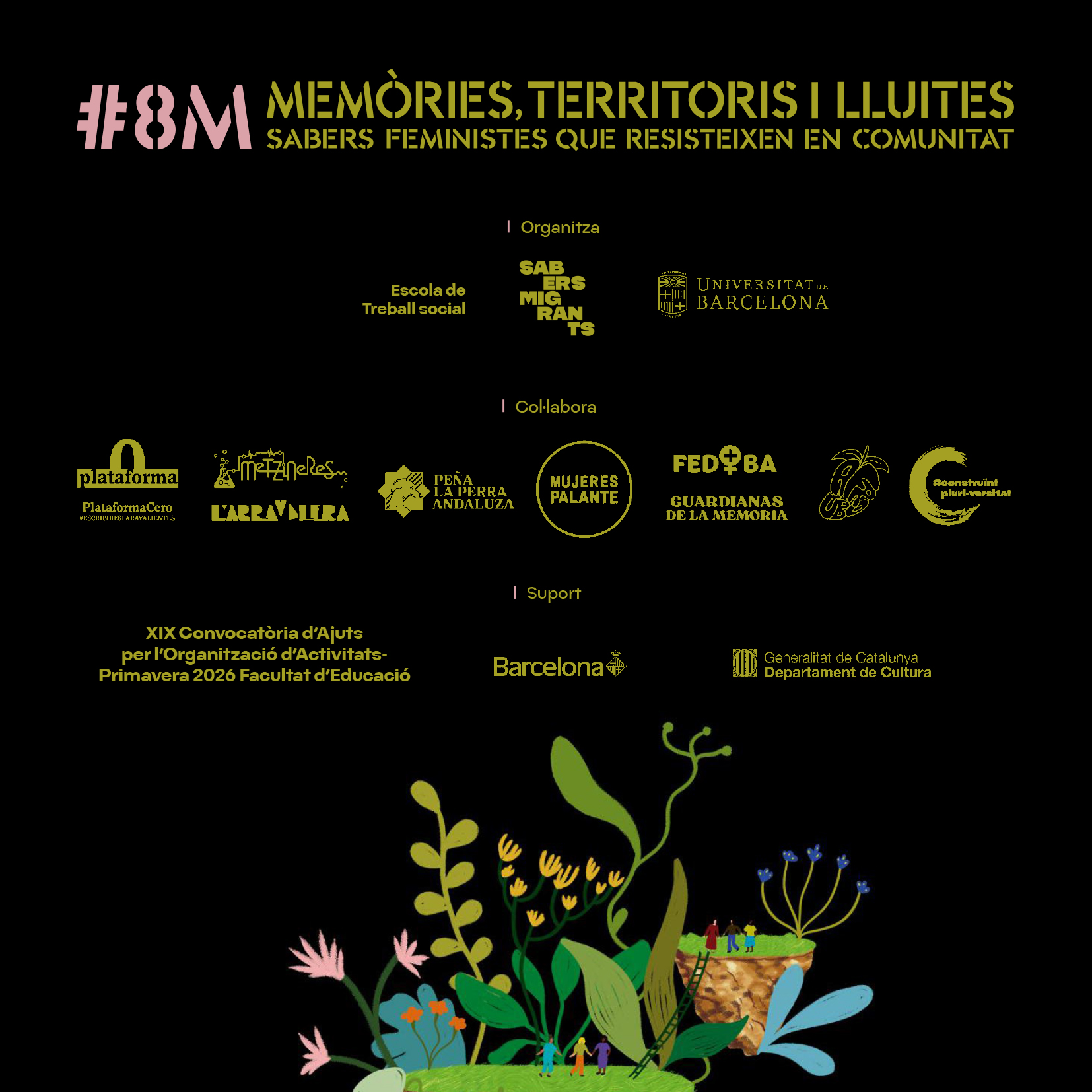 “Memòries, territoris i lluites. Sabers feministes que resisteixen en comunitat” és una trobada col·lectiva on poder escoltar-nos, compartir les nostres històries i reconèixer-nos des de la pluralitat d’experiències i les múltiples posicionalitats que habitem. Un espai on tenir cura —i cuidar-nos— esdevé un gest polític col·lectiu que connecta memòries i sabers per sostenir la vida i resistir la violència estructural.