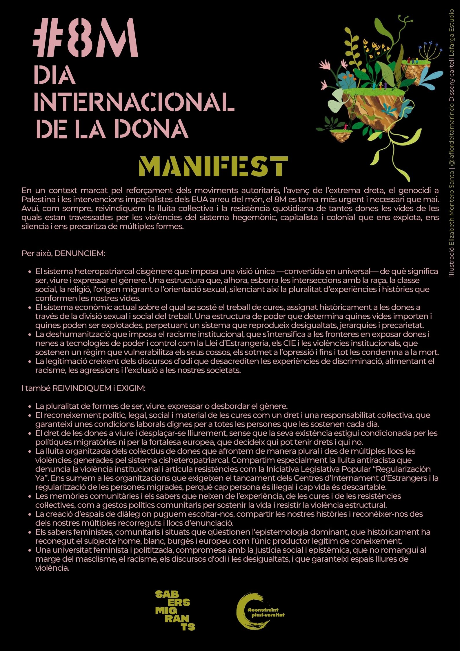 En un context marcat pel reforçament dels moviments autoritaris, l’avenç de l’extrema dreta, el genocidi a Palestina i les intervencions imperialistes dels EUA arreu del món, el 8M es torna més urgent i necessari que mai. Avui, com sempre, reivindiquem la lluita col·lectiva i la resistència quotidiana de tantes dones les vides de les quals estan travessades per les violències del sistema hegemònic, capitalista i colonial que ens explota, ens silencia i ens precaritza de múltiples formes.
