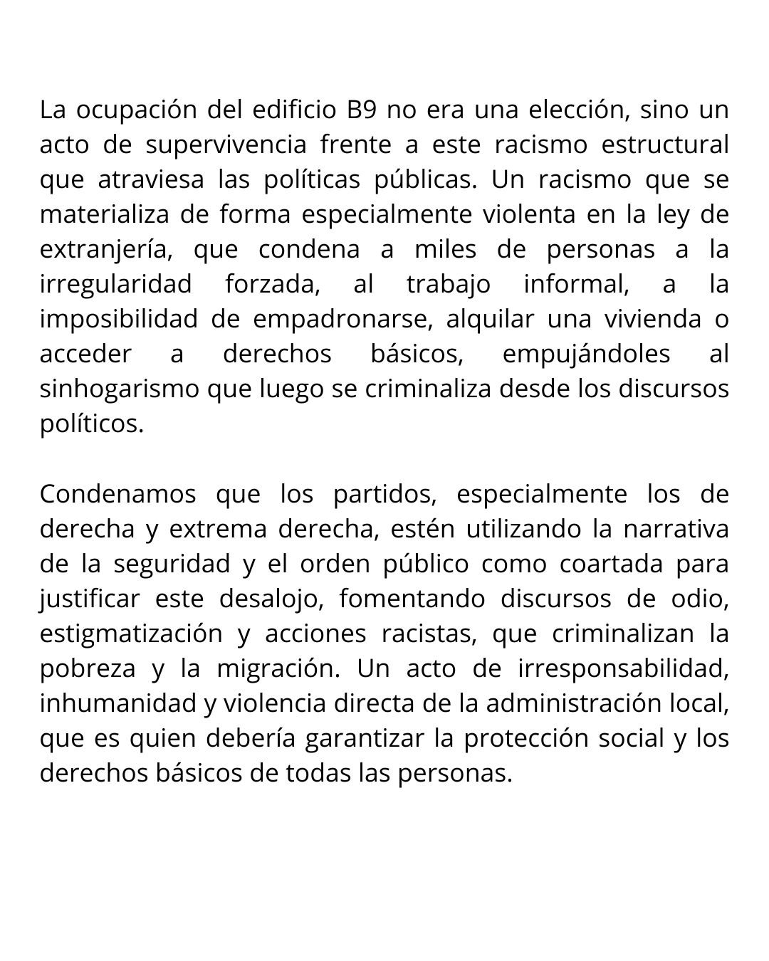 Reiteramos las obligaciones legales y políticas que tienen las administraciones públicas. Lo ocurrido en el B9 no es inevitable. Es una decisión política. Y como tal, tiene responsables. Solicitamos al Ayuntamiento de Badalona y a la Generalitat de Catalunya una respuesta inmediata y estructural, que no sea meramente puntual ni coyuntural, sino que garantice una alternativa habitacional digna y estable para las personas desalojadas y promueva su regularización administrativa, para asegurar el pleno ejercicio de sus derechos.