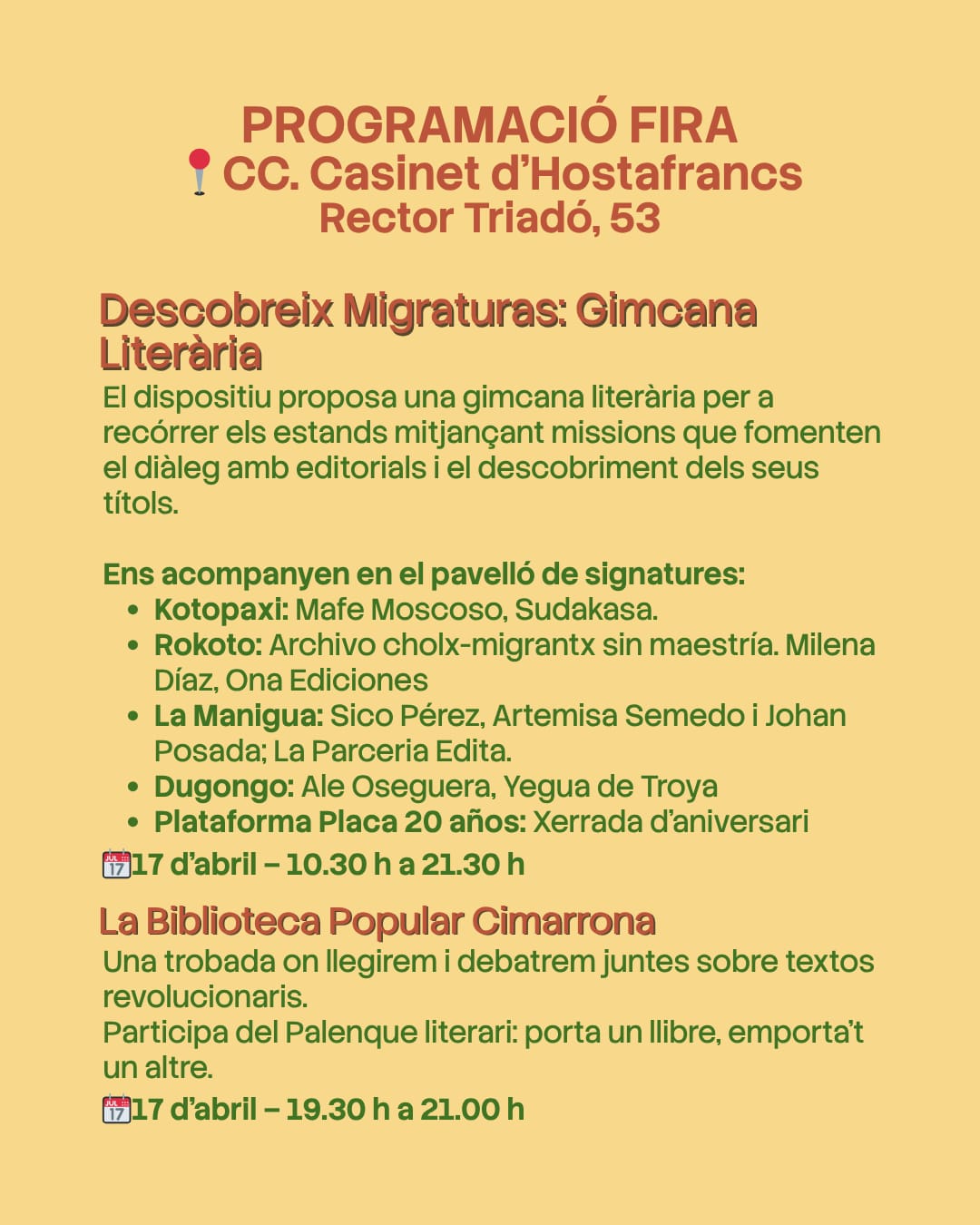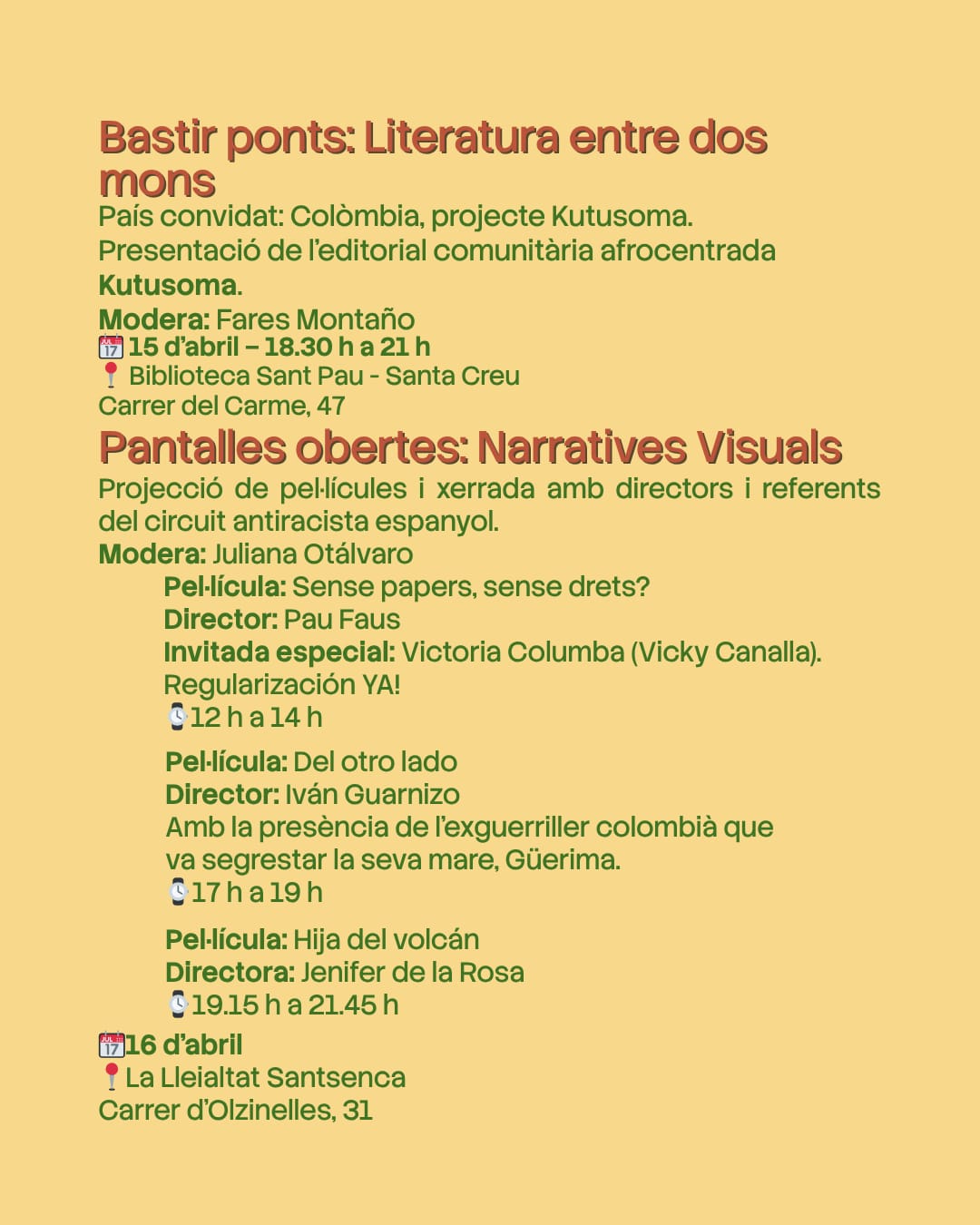Es desplegarà tot un programa increïble per tota la ciutat de Barcelona amb conversatoris, cinema-fòrum, talk show, presentacions de llibres i la Fira! Espais de trobada, diàleg, pensament crític i múltiples històries. Un exercici col·lectiu de resistència que posa en el centre la literatura migrant i les narratives pròpies.