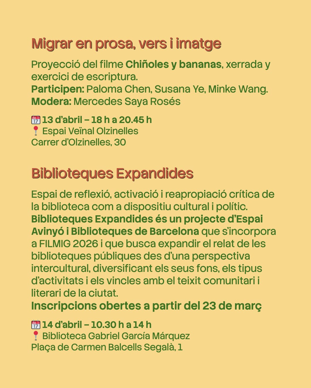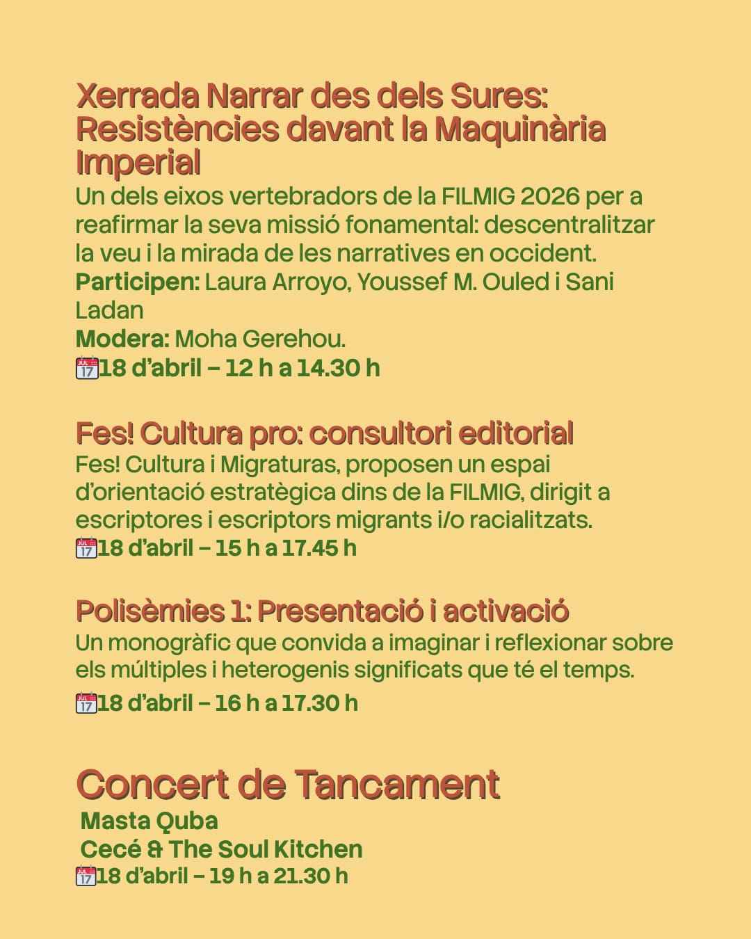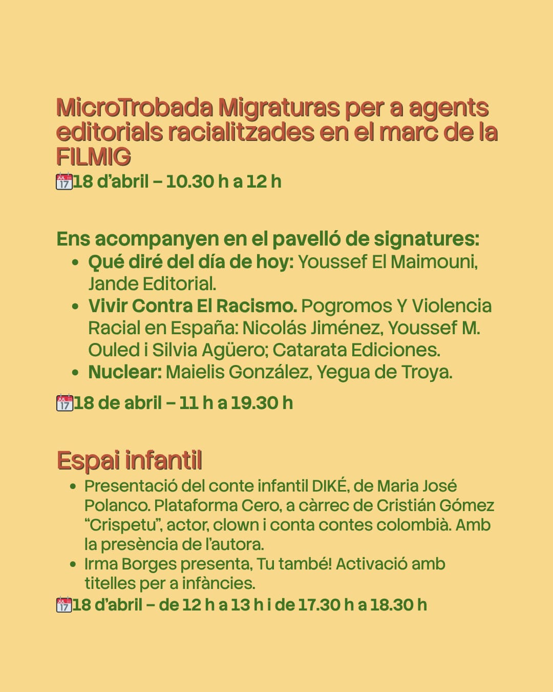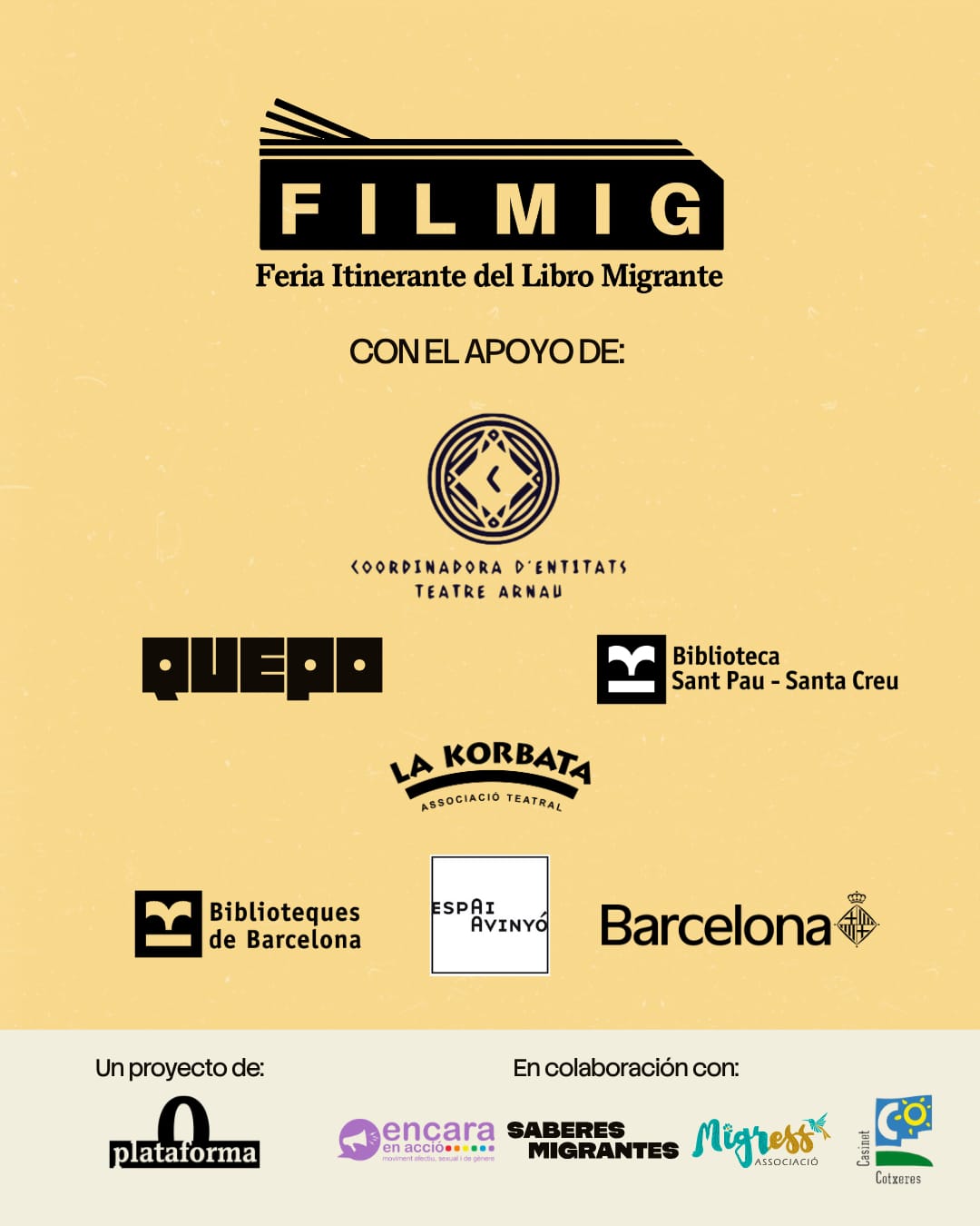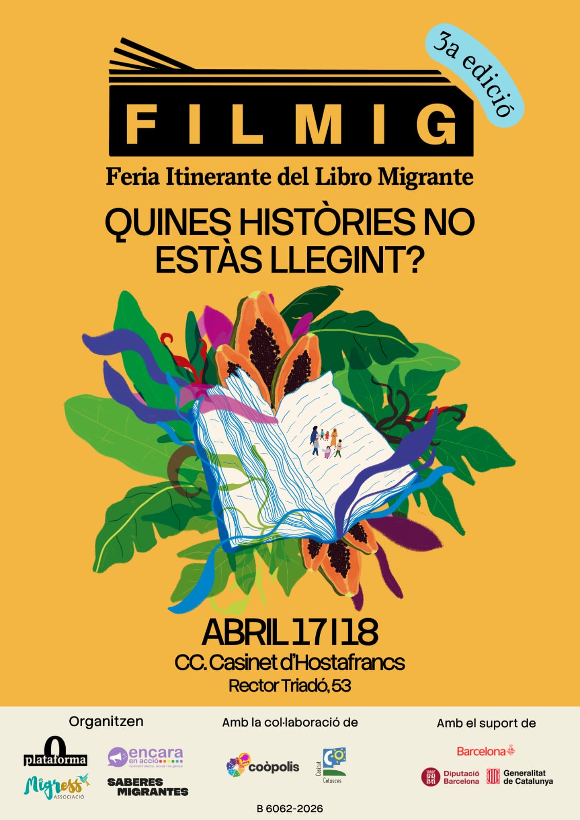 Del 13 al 18 d’abril tindrà lloc a Barcelona la 3a edició de la FILMIG. La FILMIG (Fira Itinerant del Llibre Migrant) és un esdeveniment cultural pioner creat al 2024 pel projecte editorial Plataforma 0, amb el suport de les associacions MigrESS i Encara en acció a la ciutat de Barcelona, que dona visibilitat a les narratives de les persones migrants racialitzades. En ser itinerant, la FILMIG cerca arribar a diferents comunitats i públics, ampliant el seu abast i impacte.