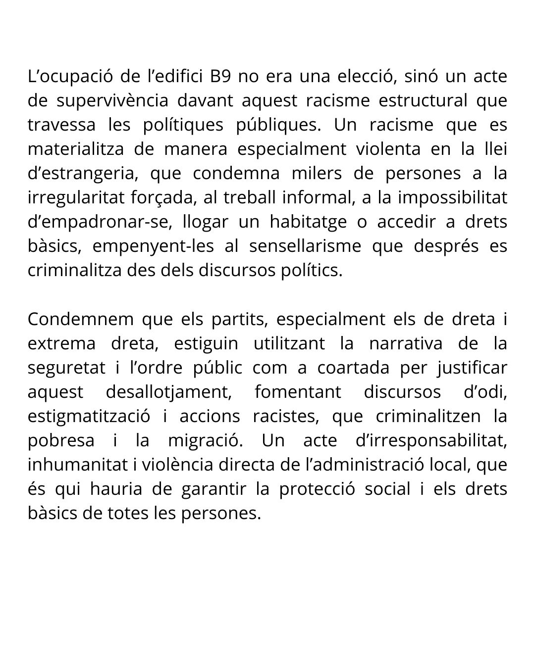 L’ocupació de l’edifici B9 no era una elecció, sinó un acte de supervivència davant aquest racisme estructural que travessa les polítiques públiques. Un racisme que es materialitza de manera especialment violenta en la llei d’estrangeria, que condemna milers de persones a la irregularitat forçada, al treball informal, a la impossibilitat d’empadronar-se, llogar un habitatge o accedir a drets bàsics, empenyent-les al sensellarisme que després es criminalitza des dels discursos polítics.
