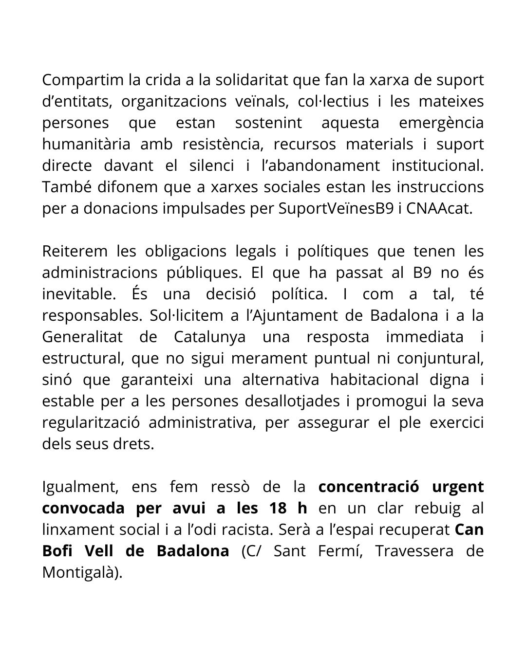 Reiterem les obligacions legals i polítiques que tenen les administracions públiques. El que ha passat al B9 no és inevitable. És una decisió política. I com a tal, té responsables. Sol·licitem a l’Ajuntament de Badalona i a la Generalitat de Catalunya una resposta immediata i estructural, que no sigui merament puntual ni conjuntural, sinó que garanteixi una alternativa habitacional digna i estable per a les persones desallotjades i promogui la seva regularització administrativa, per assegurar el ple exercici dels seus drets.