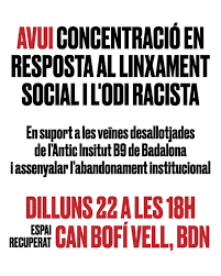 Igualment, ens fem ressò de la concentració urgent convocada per avui a les 18 h en un clar rebuig al linxament social i al racisme. Serà a l’espai recuperat Can Bofi Vell de Badalona (C/ Sant Fermí, Travessera de Montigalà).